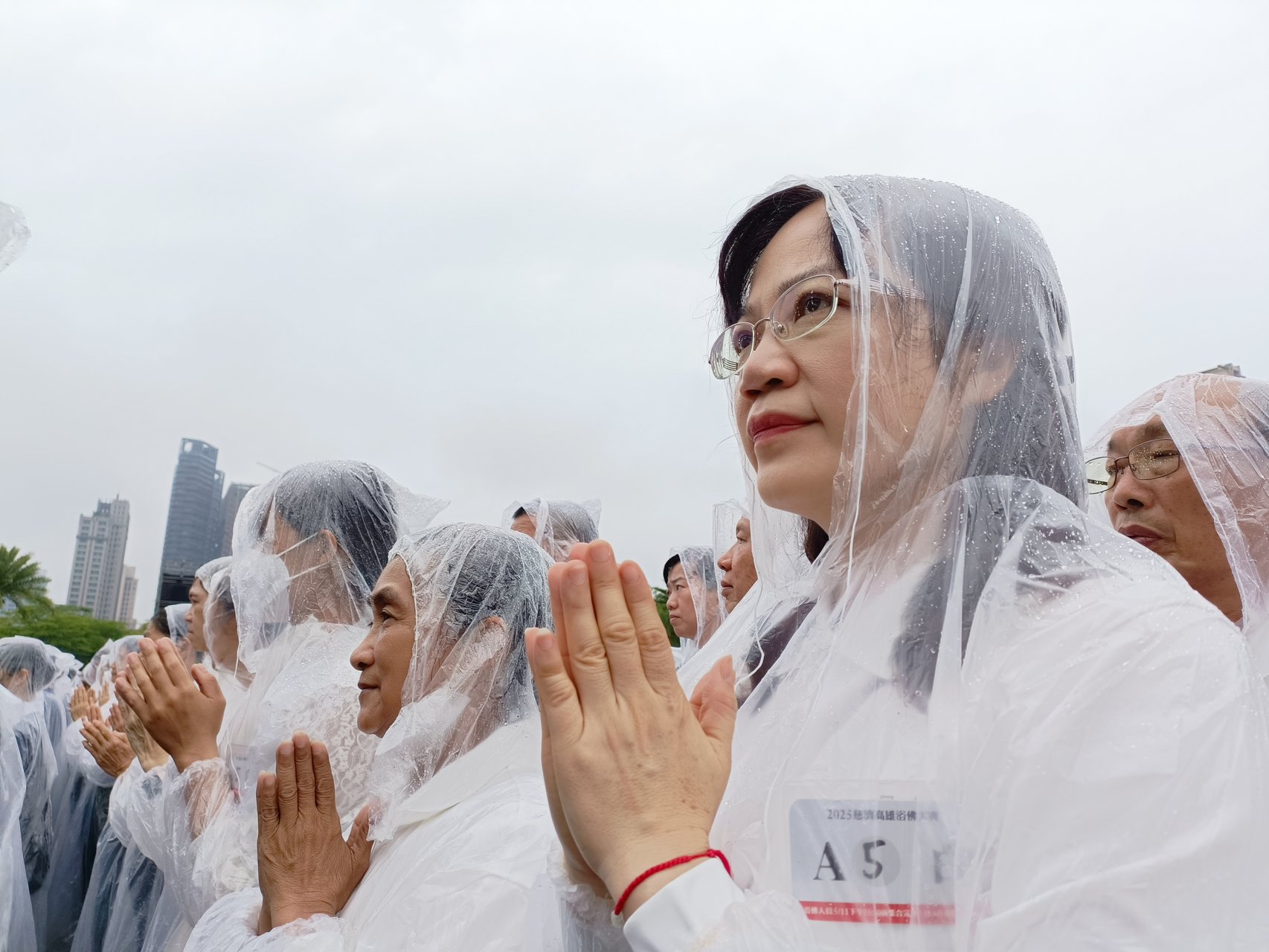 新興區區長陳靜蘭,配合隊形穿著白衣藍褲入列,看到今天下雨,